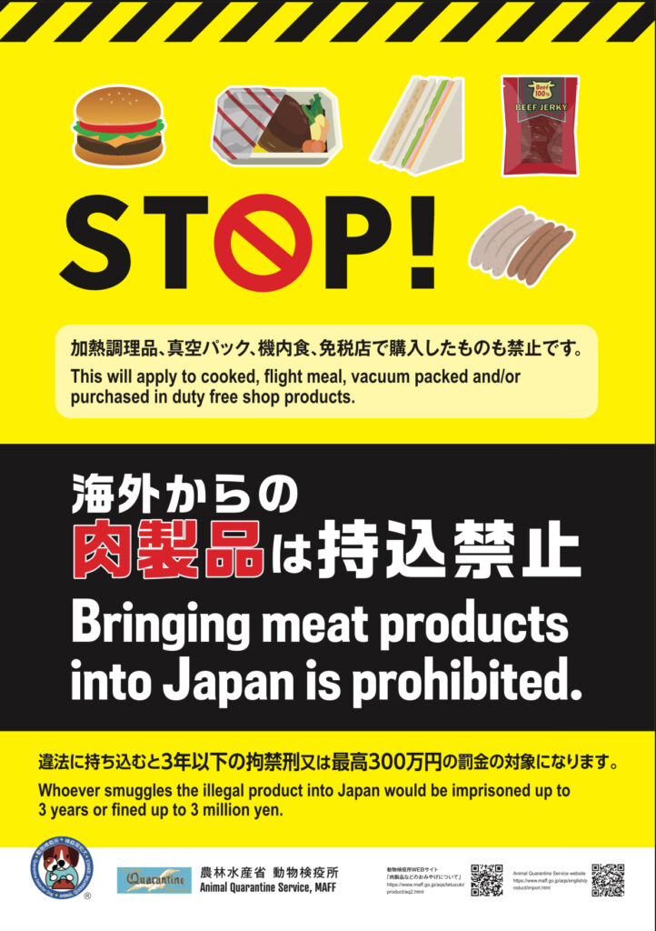 Illegal importation of meat products and other livestock products into Japan may result in a fine of up to 3 million yen (up to 50 million yen for corporations) or imprisonment of up to three years.