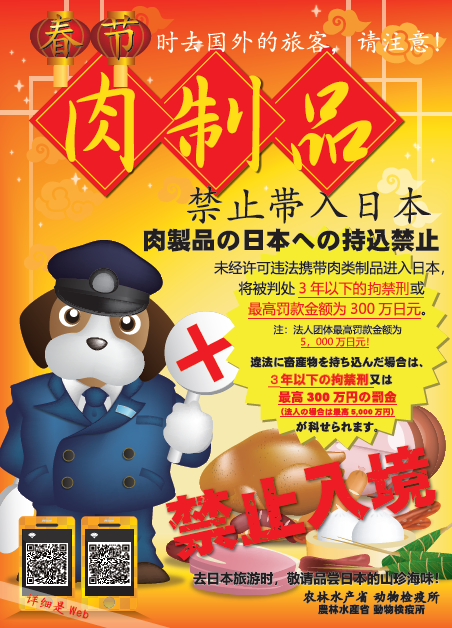 肉製品などの畜産物を違法に日本へ輸入した場合、300万円以下(法人の場合5,000万円以下)の罰金又は3年以下の拘禁刑が科せられることがあります。